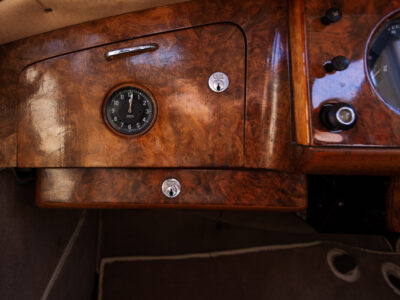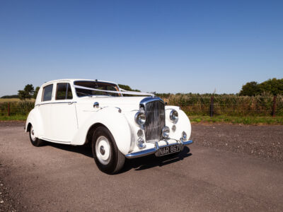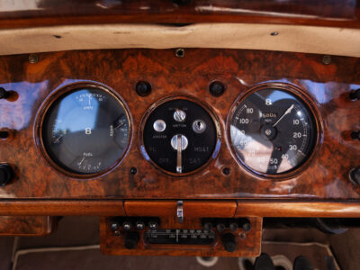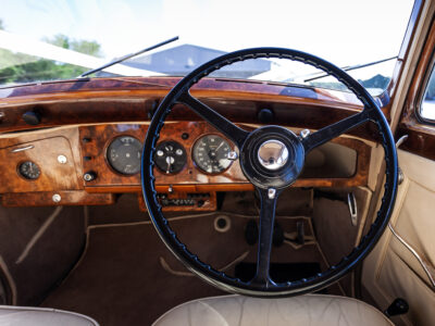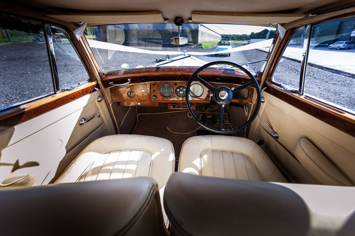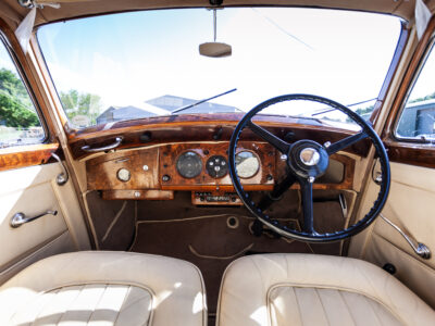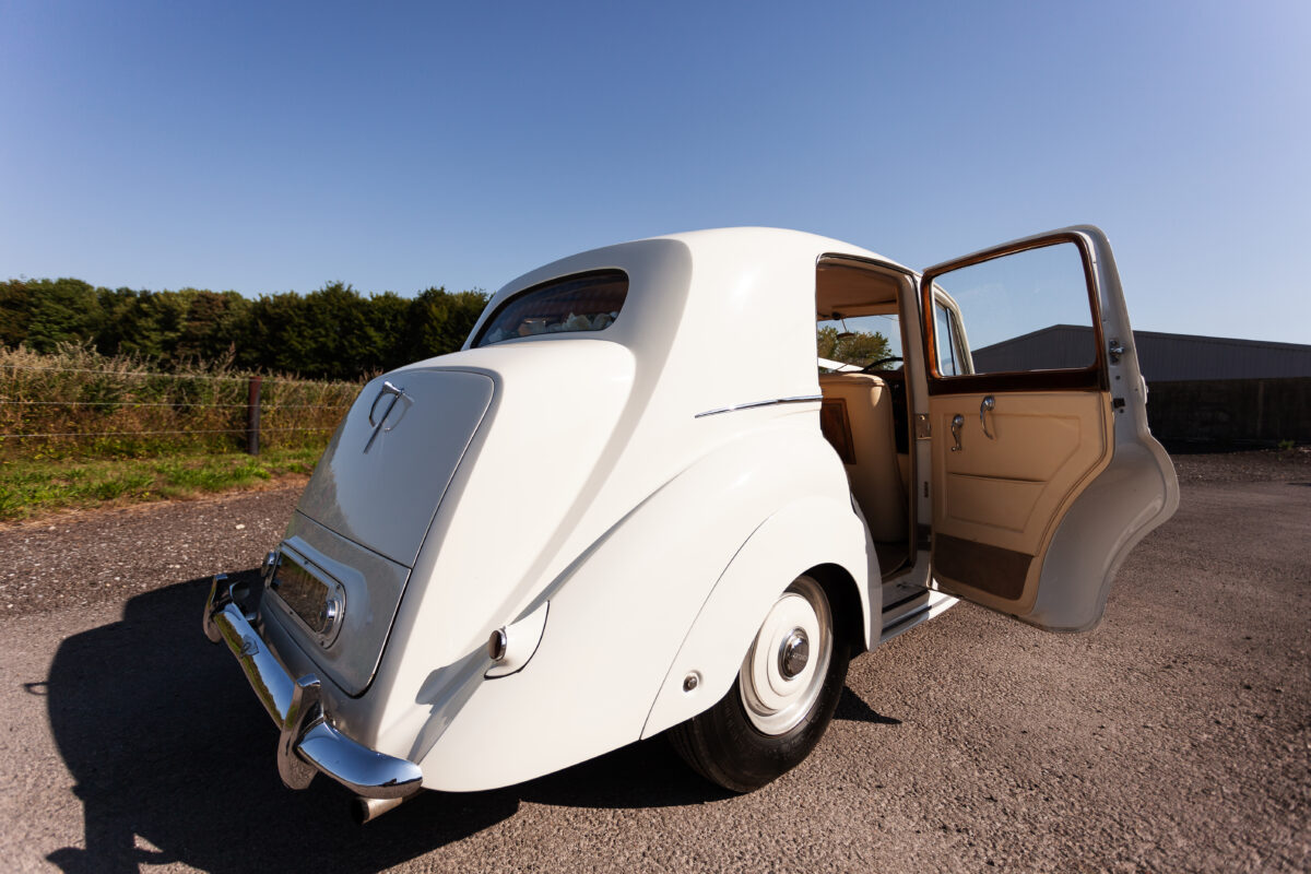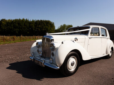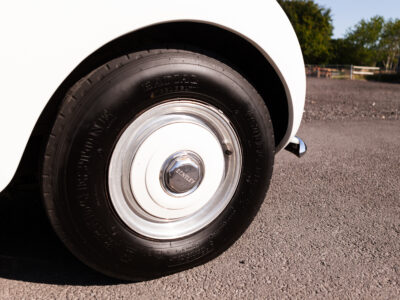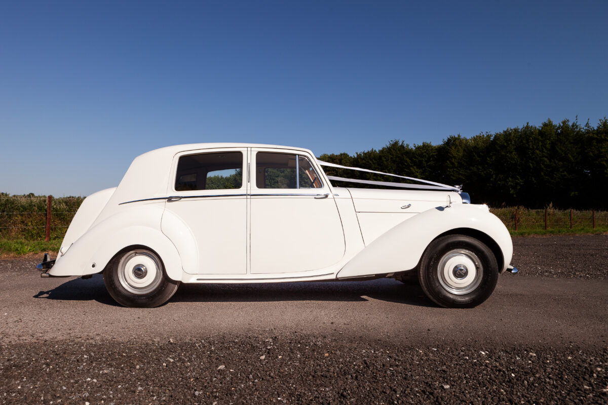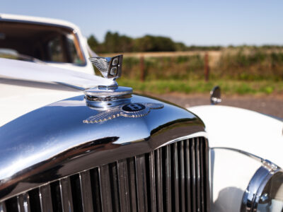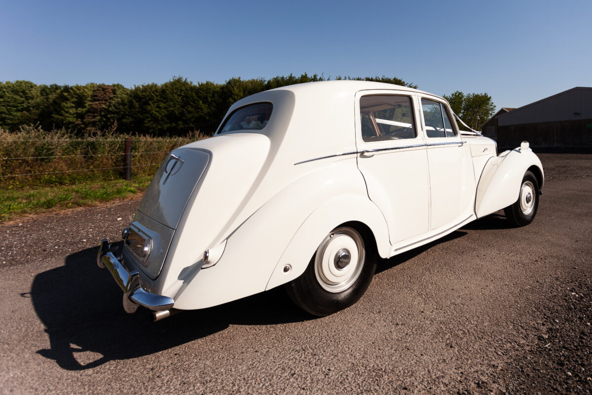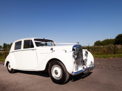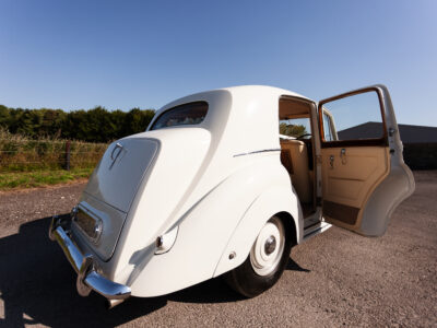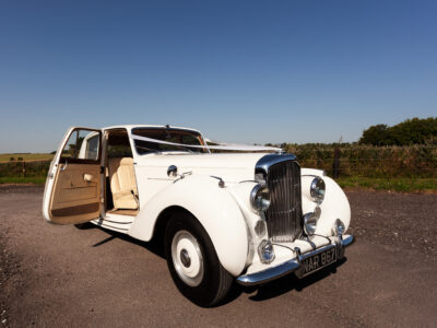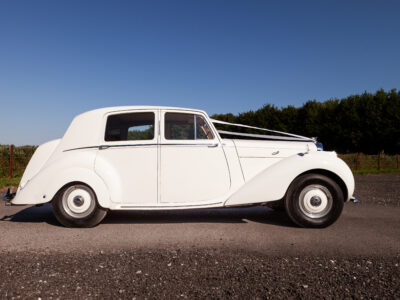 She was originally purchased in 1951 as a ‘big bore-small boot’ Sports Saloon in Black with Tan leather. She had a major refurbishment in 1991 and the colour was changed to white with matching leather. She went to Poland in 2009 and was used as a wedding car which has been her career ever since. On return to the UK she got back her original number plate. She has had bits of rust and paintwork refurbished and looks stunning. Underneath the bonnet there was a full engine rebuild two years ago (new crank, ends, rods, pistons etc). and she runs beautifully. The wood veneer has suffered a bit of damp ingress from the windscreen. Leather is excellent. She has her original logbook and bits of historical paperwork.
