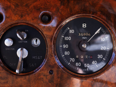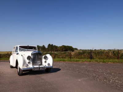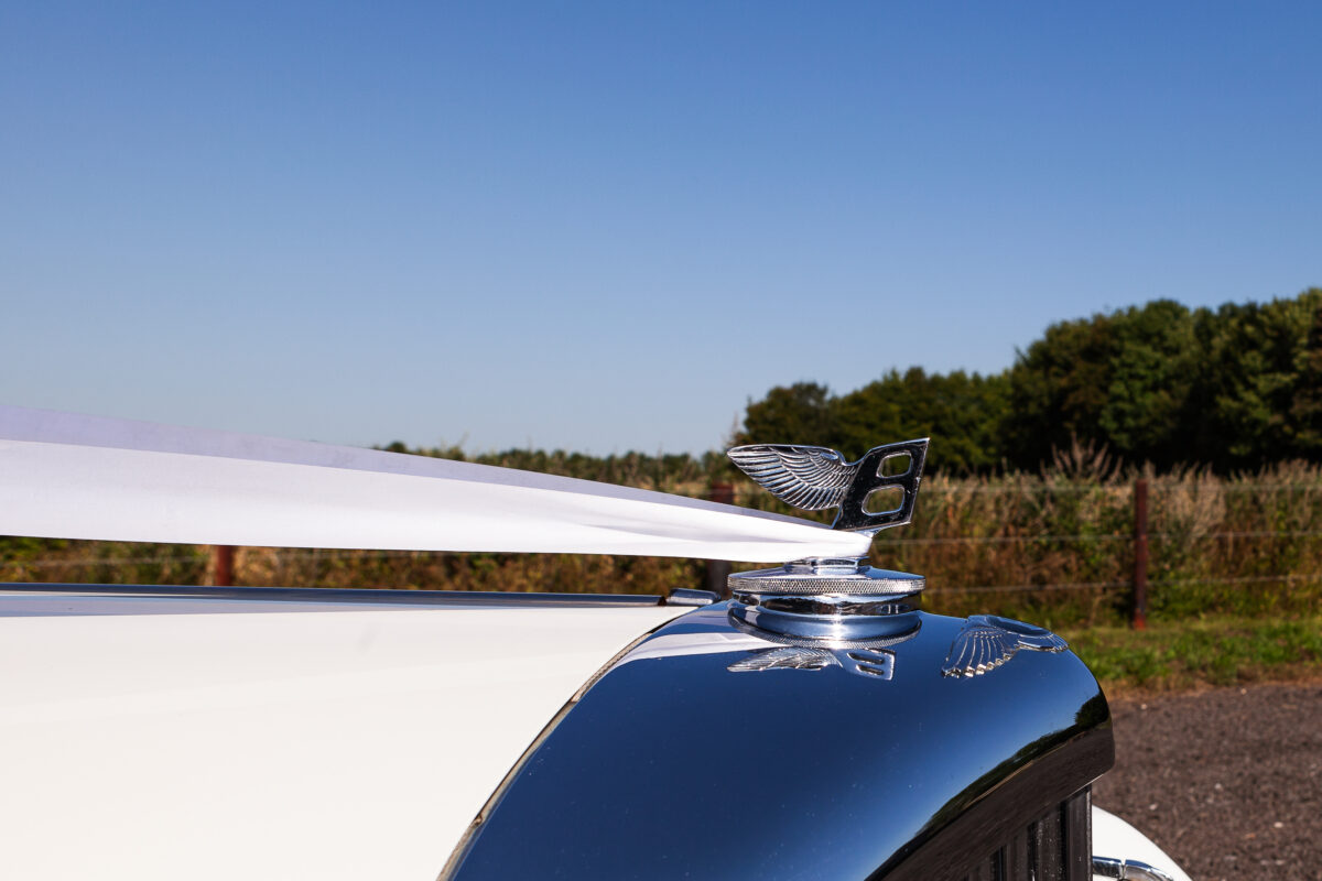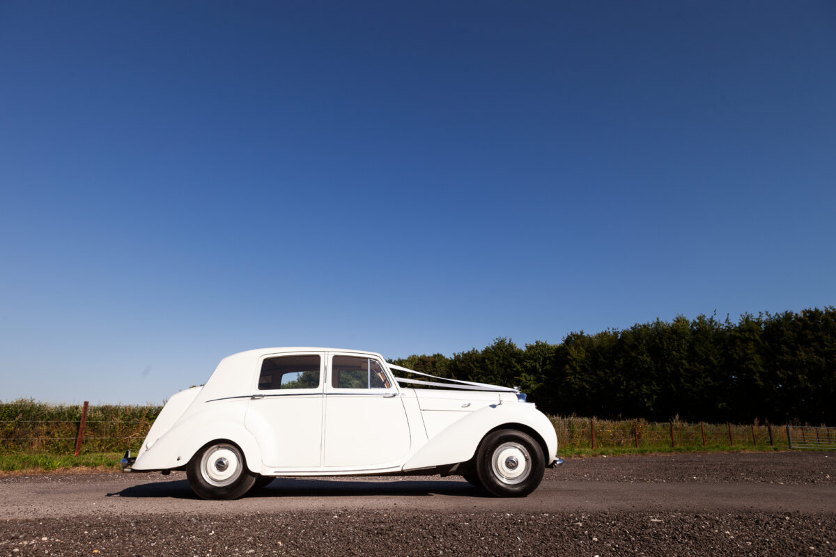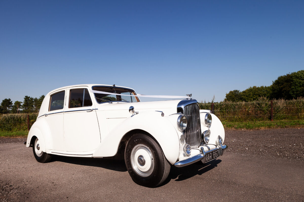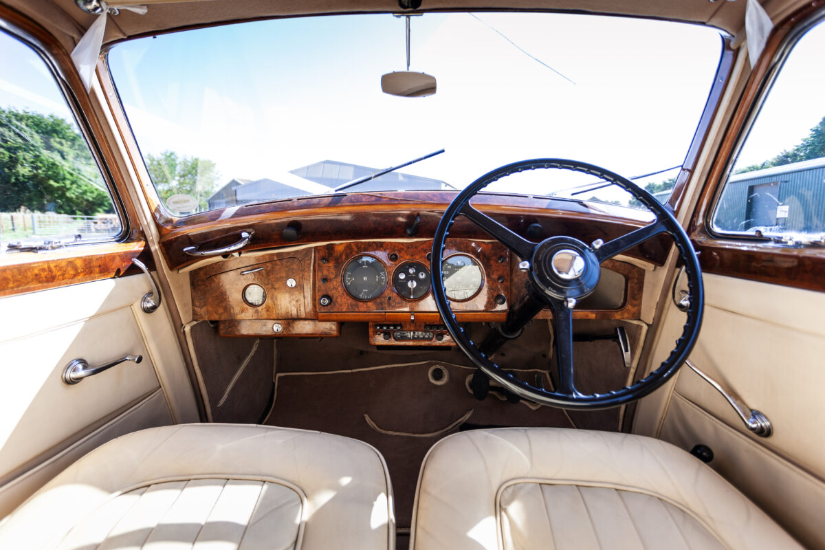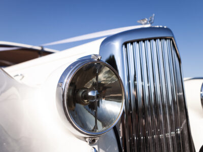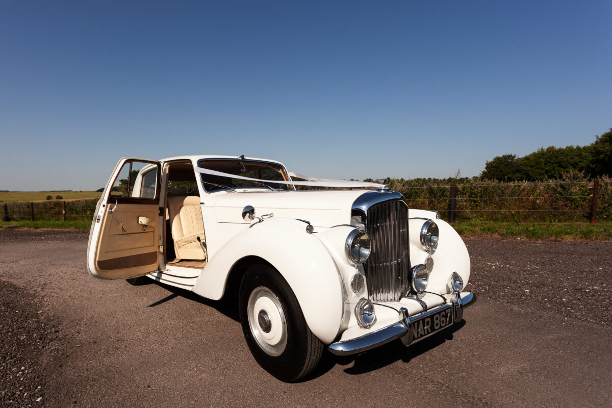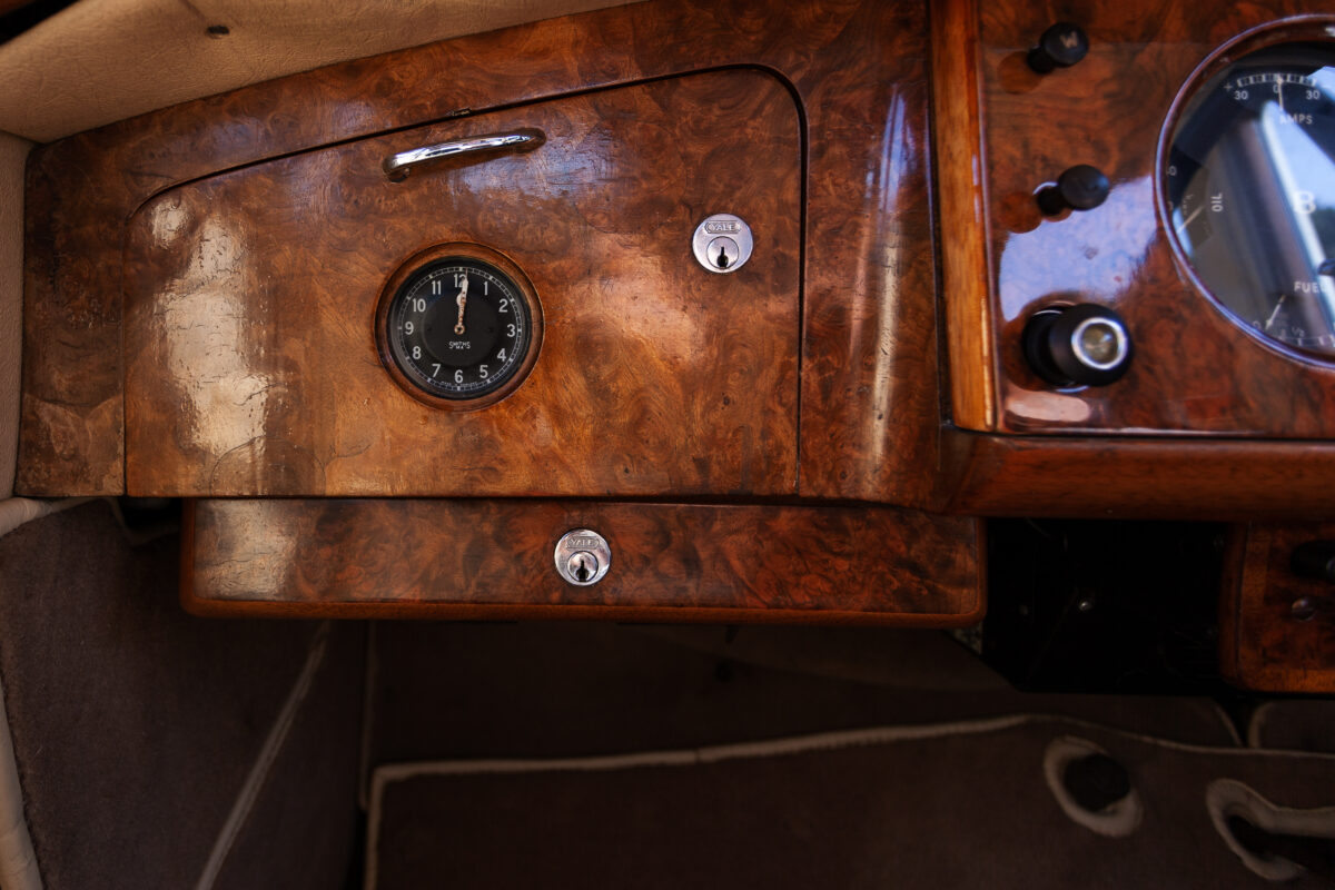 She was originally purchased in 1951 as a ‘big bore-small boot’ Sports Saloon in Black with Tan leather. She had a major refurbishment in 1991 and the colour was changed to white with matching leather. She went to Poland in 2009 and was used as a wedding car which has been her career ever since. On return to the UK she got back her original number plate. She has had bits of rust and paintwork refurbished and looks stunning. Underneath the bonnet there was a full engine rebuild two years ago (new crank, ends, rods, pistons etc). and she runs beautifully. The wood veneer has suffered a bit of damp ingress from the windscreen. Leather is excellent. She has her original logbook and bits of historical paperwork.
