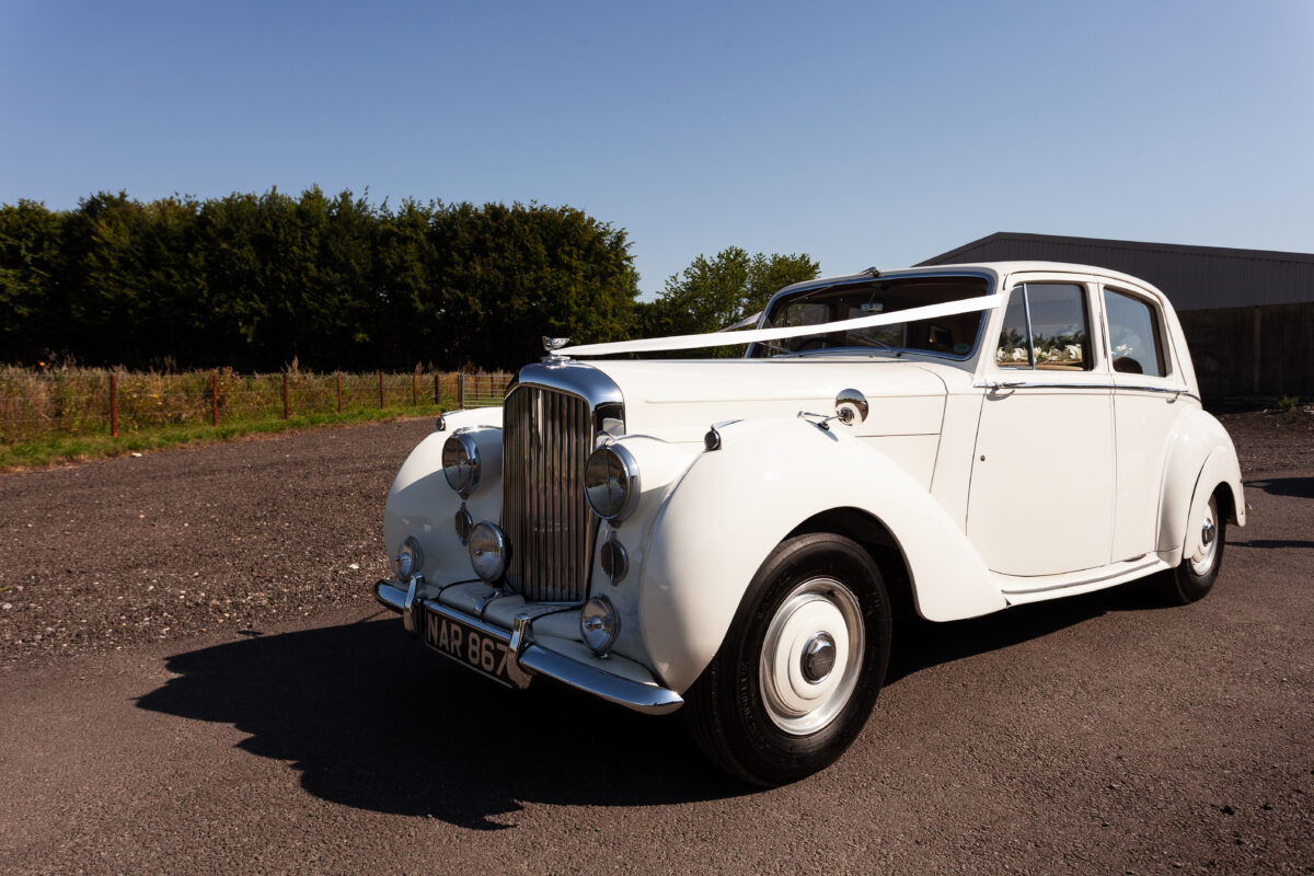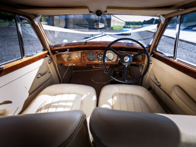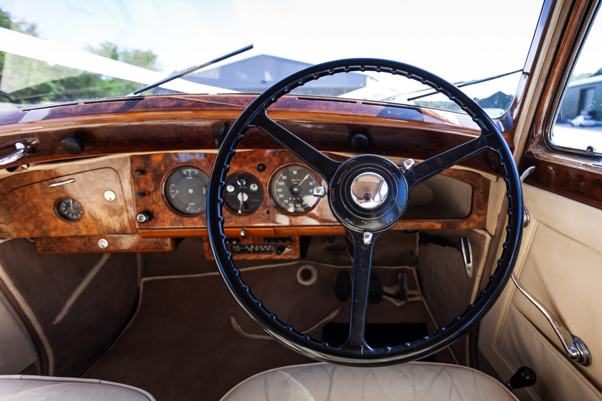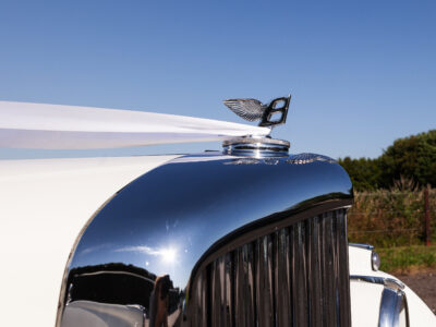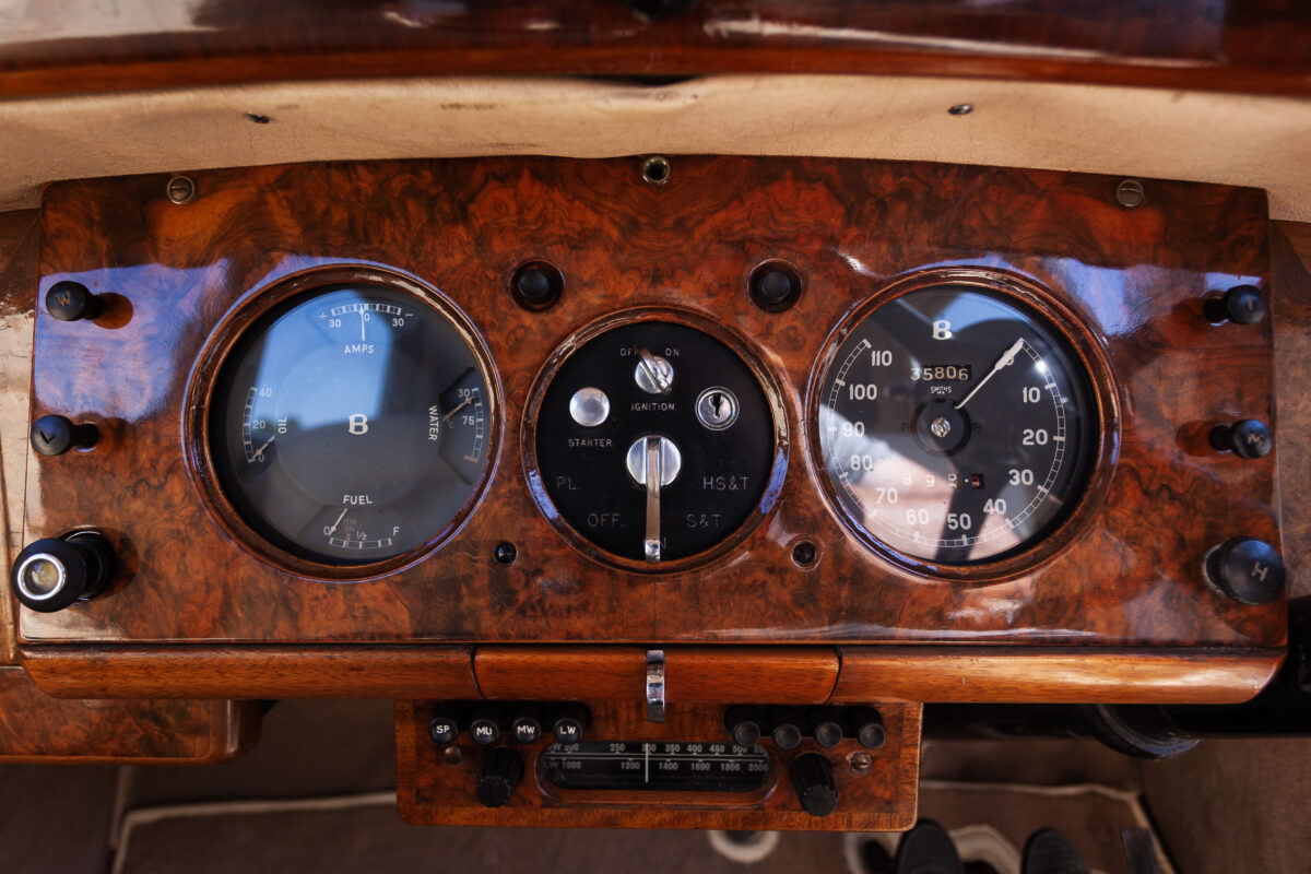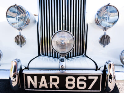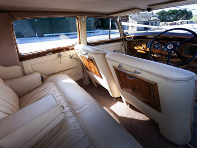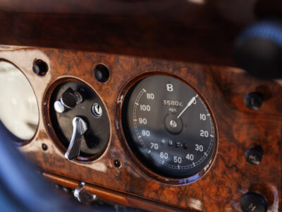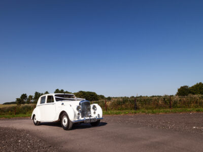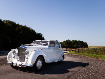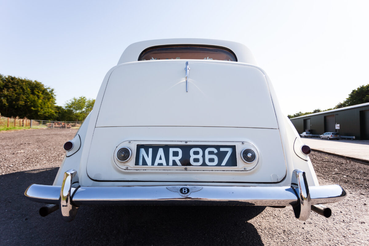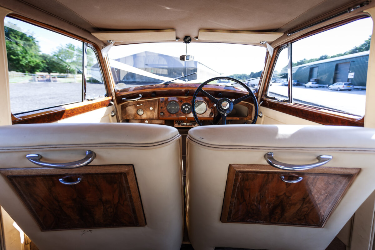 She was originally purchased in 1951 as a ‘big bore-small boot’ Sports Saloon in Black with Tan leather. She had a major refurbishment in 1991 and the colour was changed to white with matching leather. She went to Poland in 2009 and was used as a wedding car which has been her career ever since. On return to the UK she got back her original number plate. She has had bits of rust and paintwork refurbished and looks stunning. Underneath the bonnet there was a full engine rebuild two years ago (new crank, ends, rods, pistons etc). and she runs beautifully. The wood veneer has suffered a bit of damp ingress from the windscreen. Leather is excellent. She has her original logbook and bits of historical paperwork.
