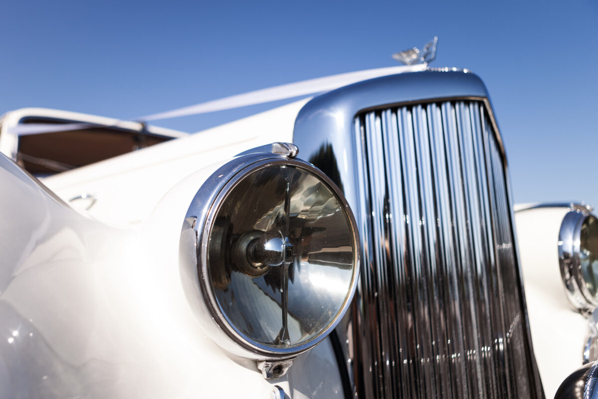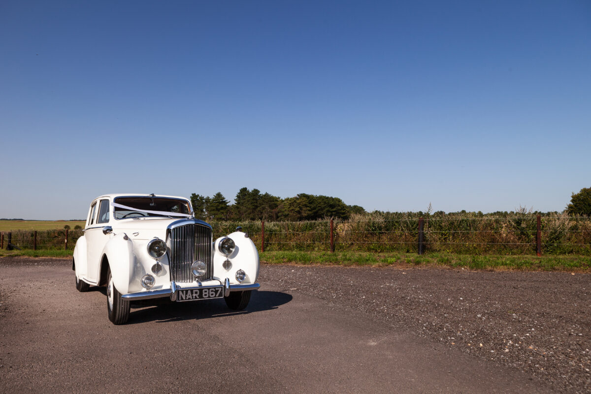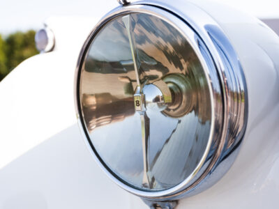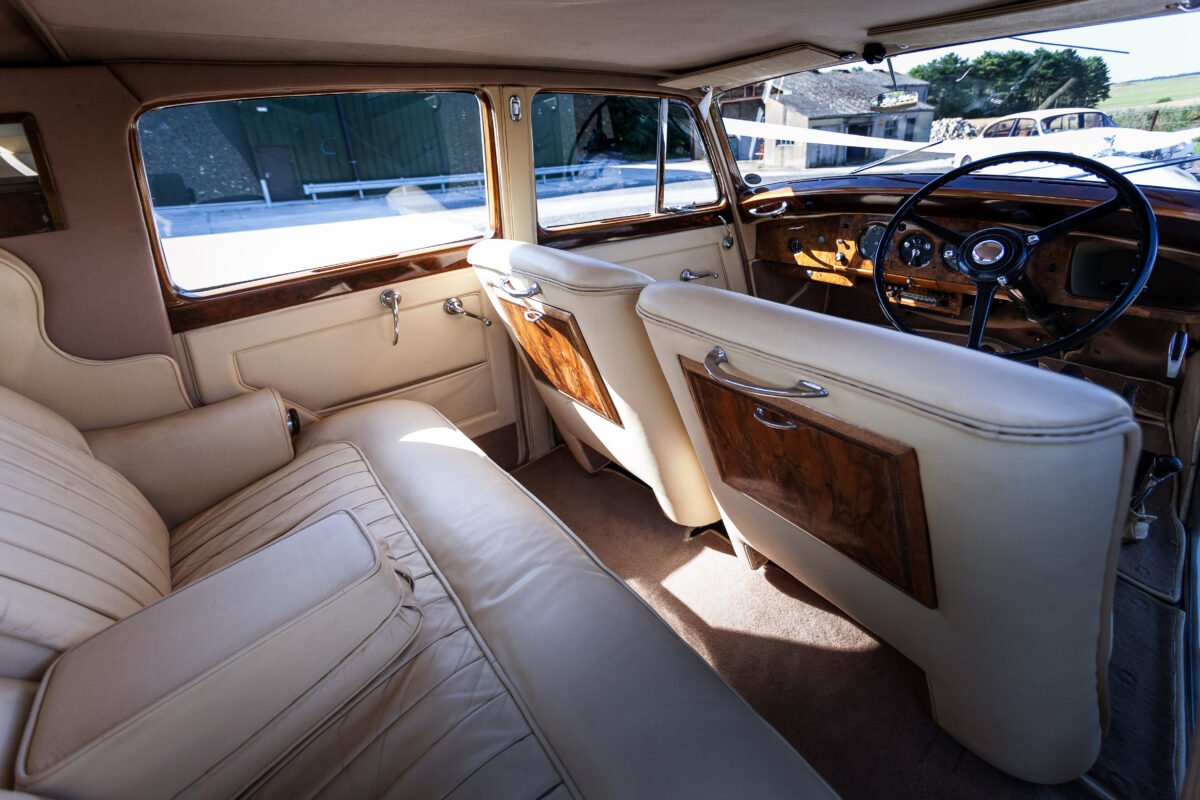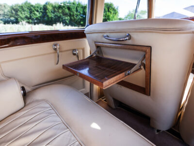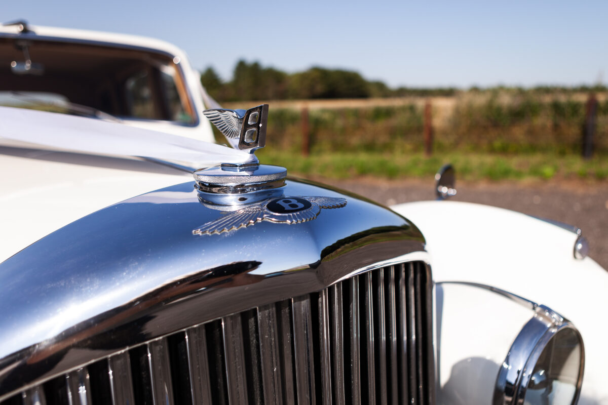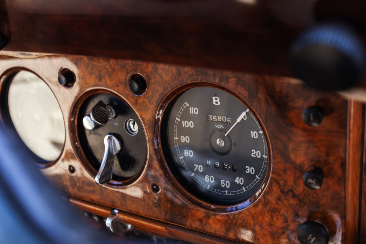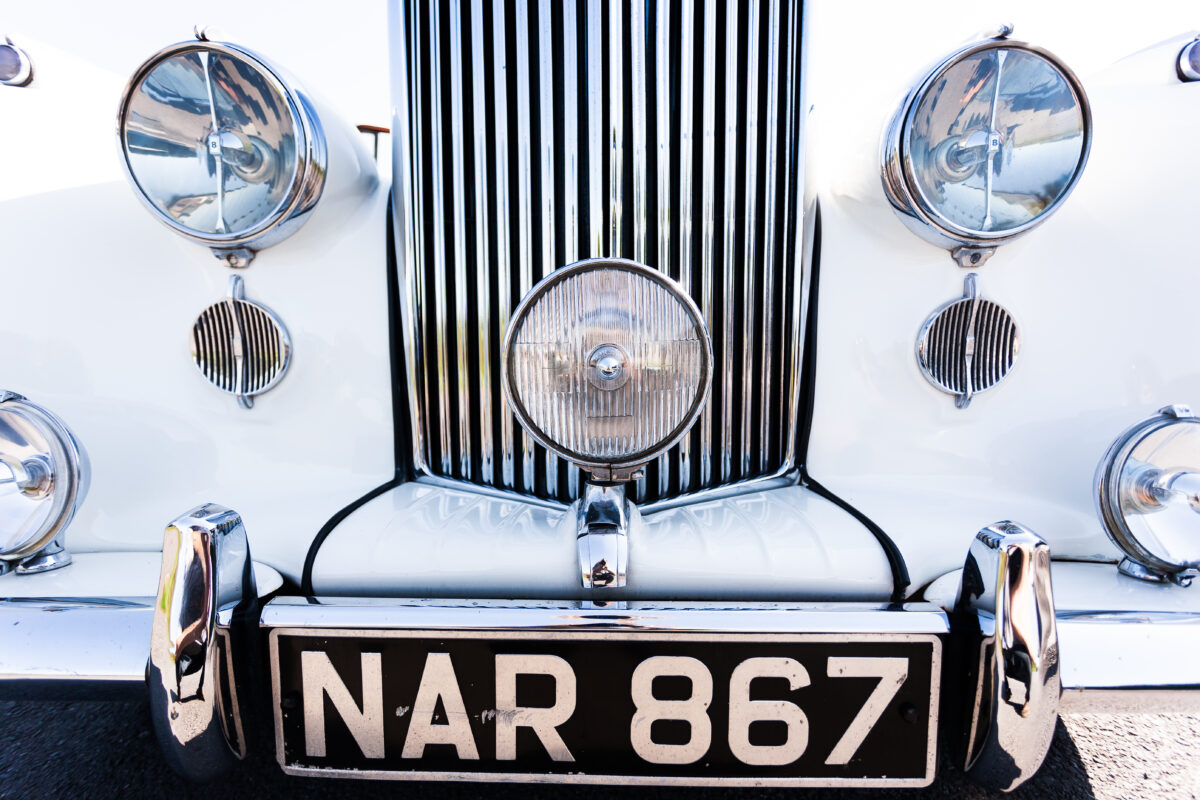 She was originally purchased in 1951 as a ‘big bore-small boot’ Sports Saloon in Black with Tan leather. She had a major refurbishment in 1991 and the colour was changed to white with matching leather. She went to Poland in 2009 and was used as a wedding car which has been her career ever since. On return to the UK she got back her original number plate. She has had bits of rust and paintwork refurbished and looks stunning. Underneath the bonnet there was a full engine rebuild two years ago (new crank, ends, rods, pistons etc). and she runs beautifully. The wood veneer has suffered a bit of damp ingress from the windscreen. Leather is excellent. She has her original logbook and bits of historical paperwork.